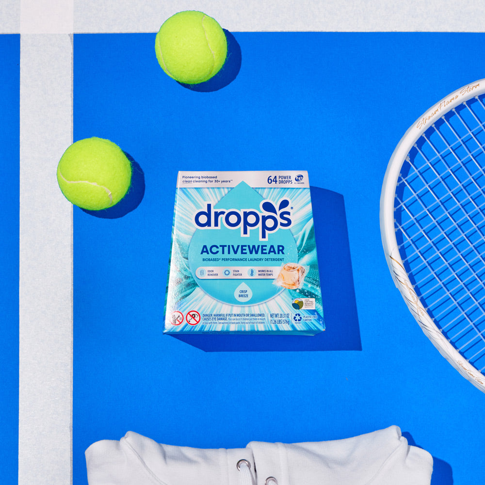 Dropps Odor Eraser packaging on a stack of colorful towels on a light purple background